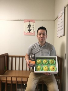 二十世紀梨と一緒にポーズ♪当館パンフレットも一緒です♪